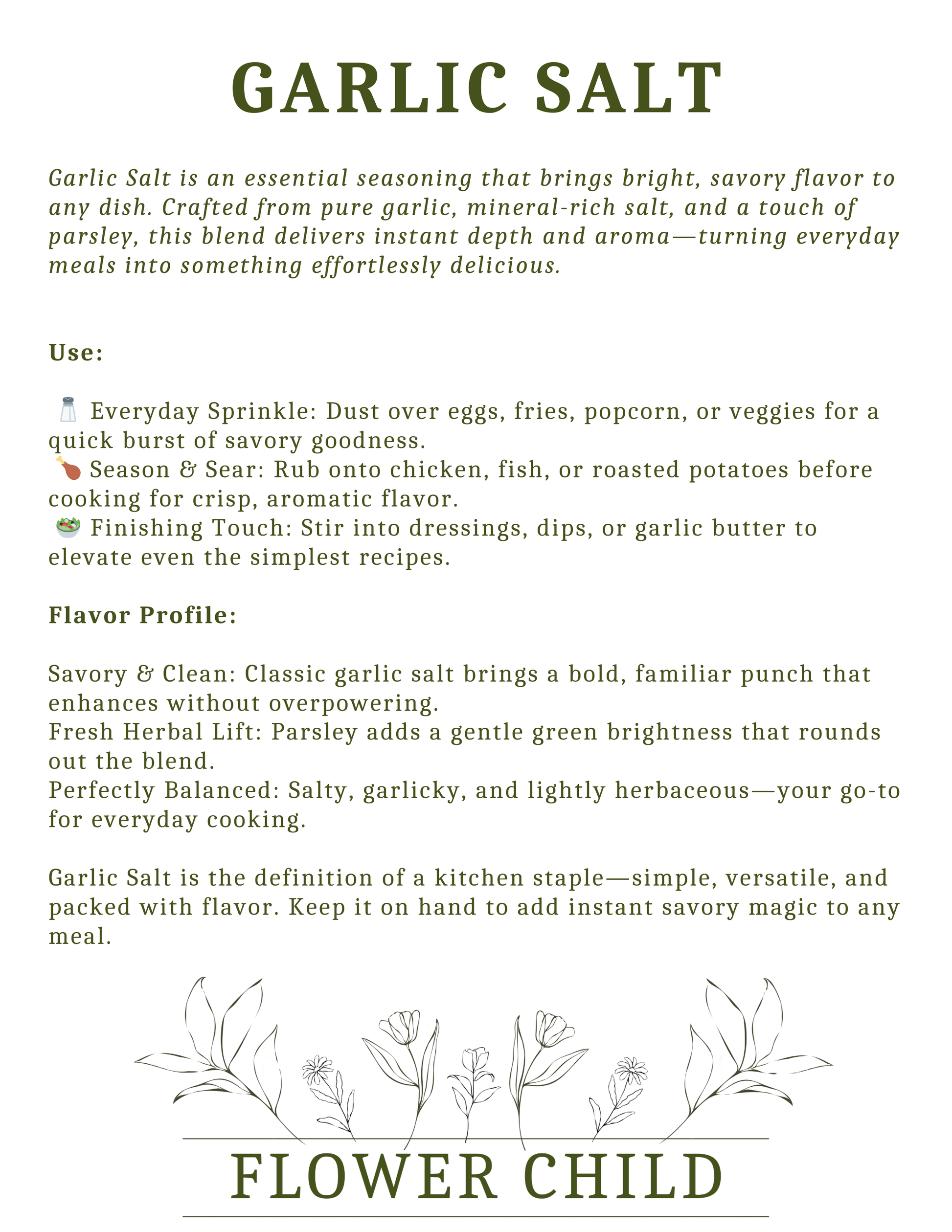 Garlic Salt is a simple yet essential seasoning that brings bright, savory flavor to any dish. Crafted from pure garlic, mineral-rich salt, and a touch of parsley, this blend delivers instant depth and aroma—turning everyday meals into something effortlessly delicious.