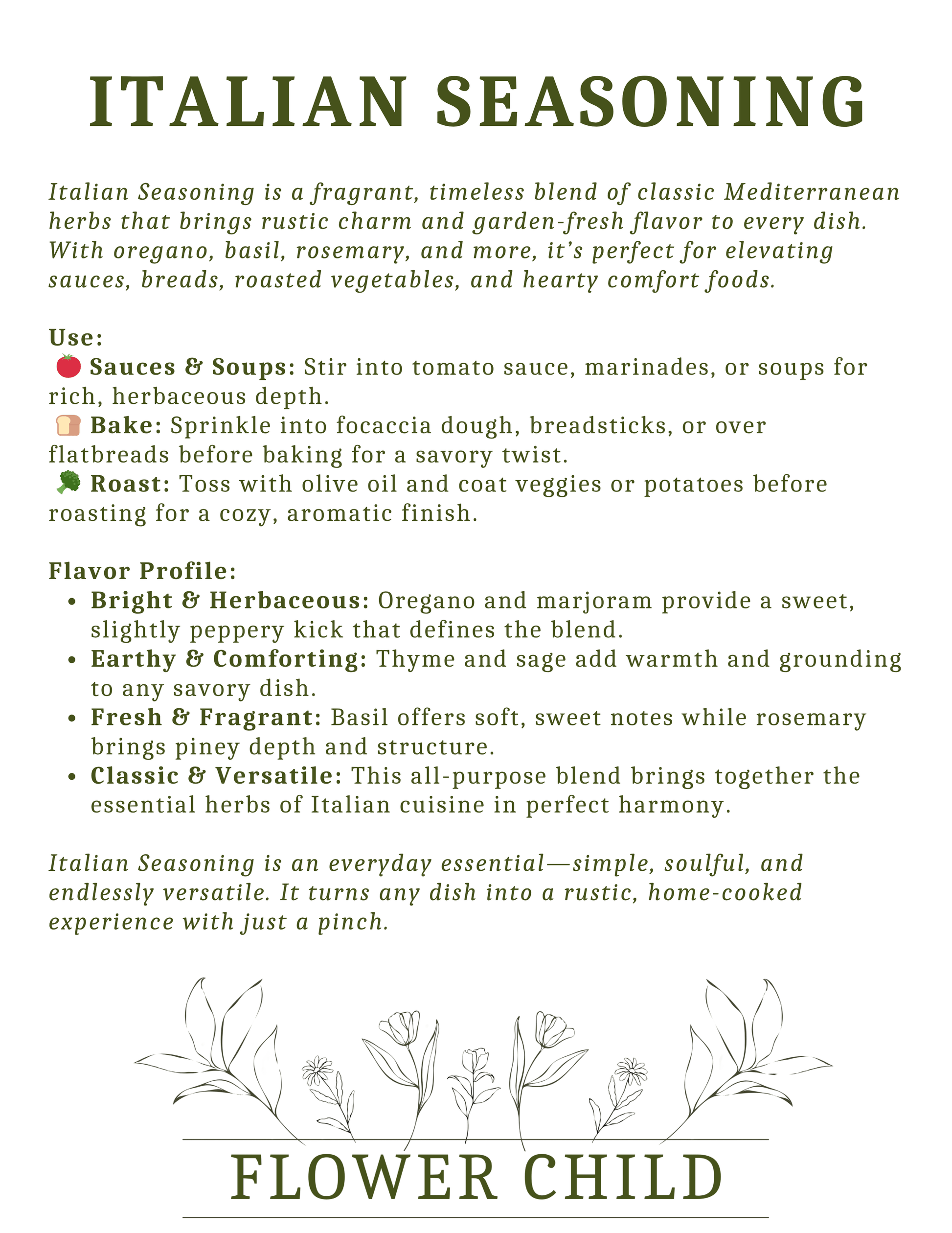 Bring home the heart of the Mediterranean with this aromatic blend of oregano, thyme, marjoram, basil, rosemary, and sage. Italian Seasoning is your go-to herb mix for effortlessly adding warmth, depth, and rustic charm to everyday dishes. From pasta sauces to roasted veggies, every sprinkle evokes sun-drenched hillsides and home-cooked comfort.