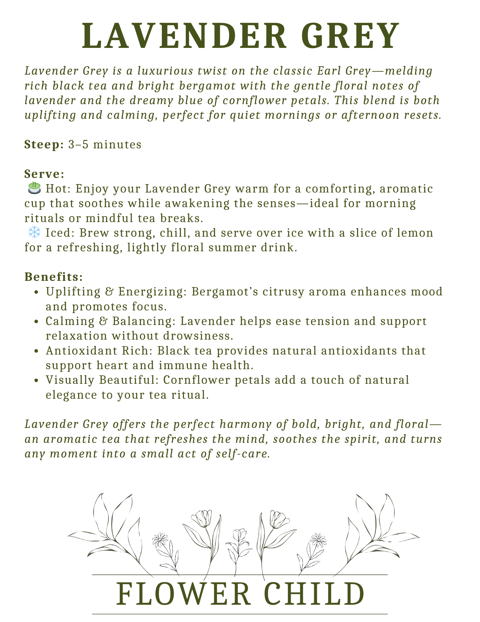 🍵 Hot: Enjoy your Lavender Grey warm for a comforting, aromatic cup that soothes while awakening the senses—ideal for morning rituals or mindful tea breaks.