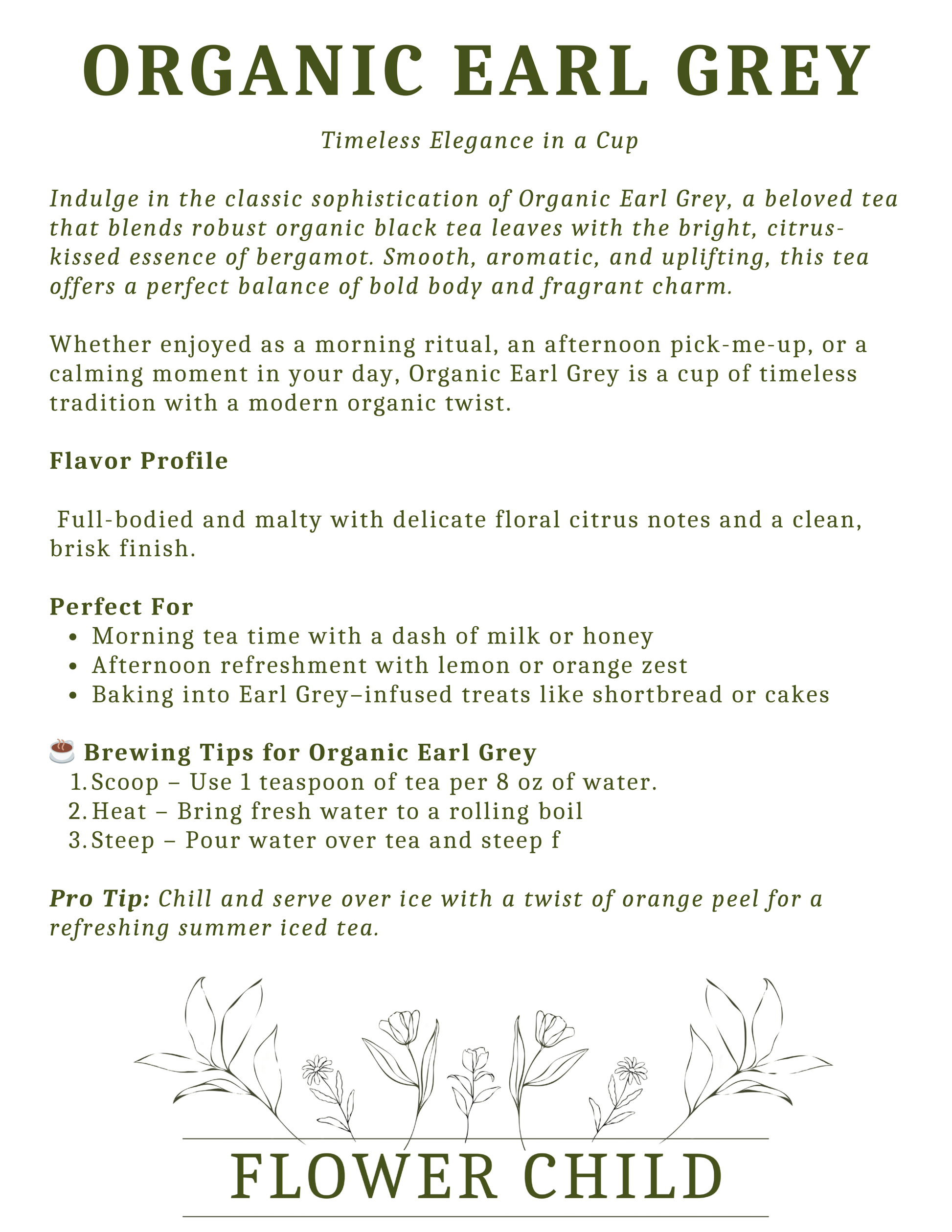 Whether enjoyed as a morning ritual, an afternoon pick-me-up, or a calming moment in your day, Organic Earl Grey is a cup of timeless tradition with a modern organic twist.