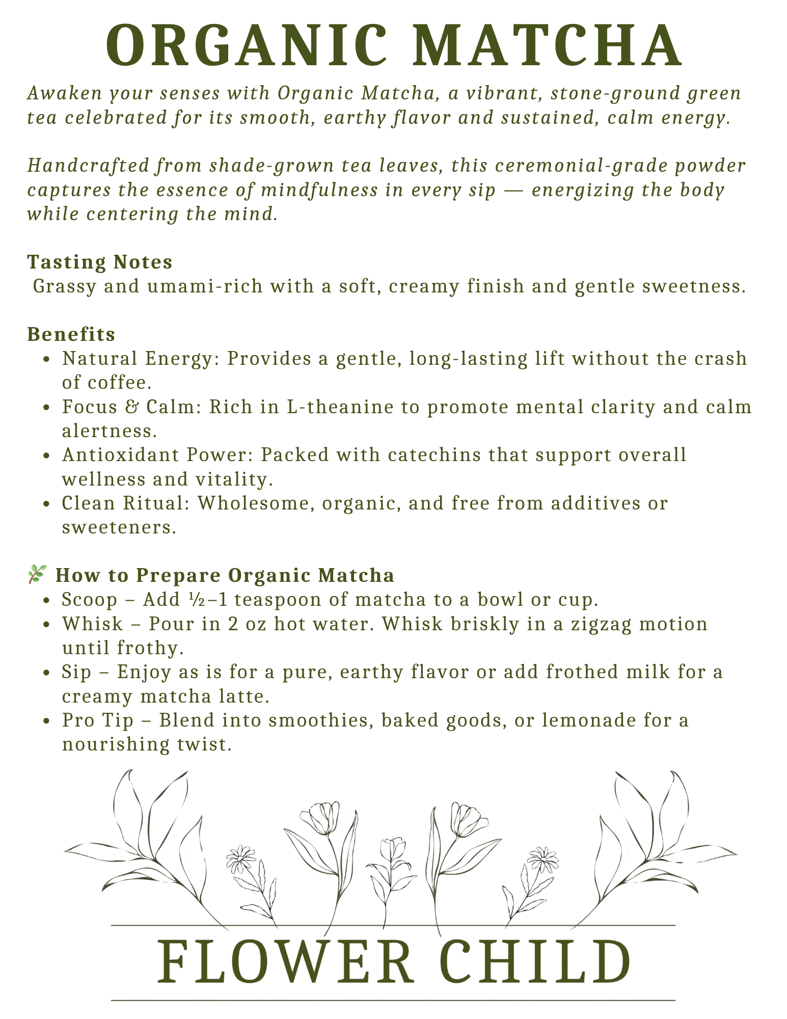 Awaken your senses with Organic Matcha, a vibrant, stone-ground green tea celebrated for its smooth, earthy flavor and sustained, calm energy. Handcrafted from shade-grown tea leaves, this ceremonial-grade powder captures the essence of mindfulness in every sip — energizing the body while centering the mind.