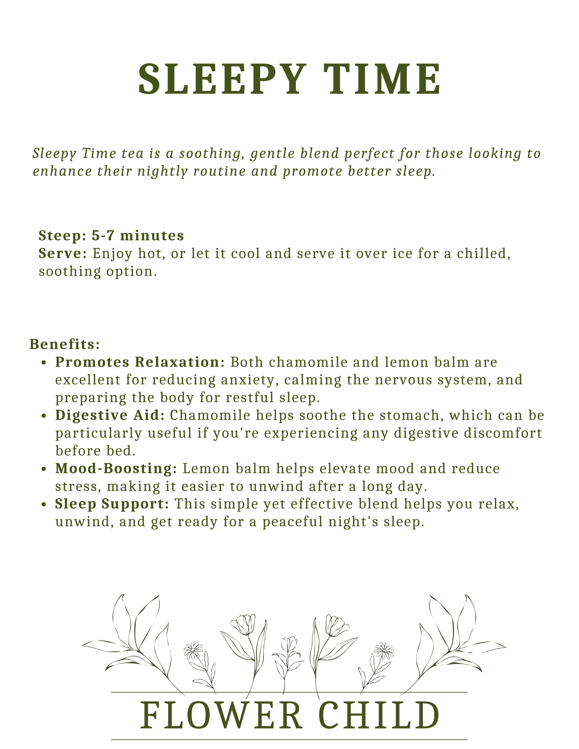 Perfect for winding down after a long day or creating a peaceful bedtime routine, Sleepy Time is your invitation to rest, restore, and recharge.