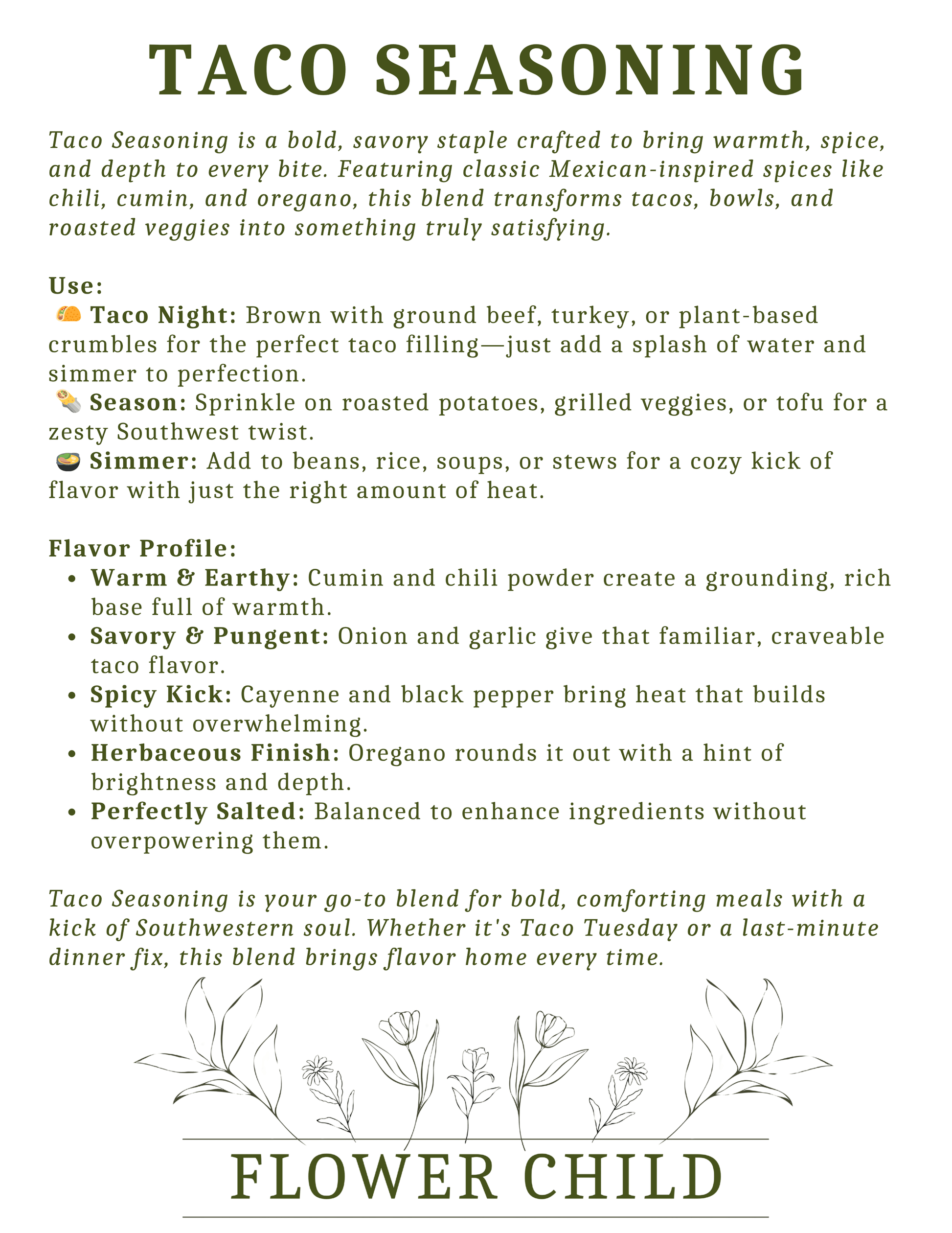 Get the party started with Taco Seasoning, a bold, zesty blend that brings authentic street taco flavor to your kitchen. Crafted with chili powder, cumin, onion, garlic, cayenne, black pepper, salt, and a touch of oregano, this all-purpose mix delivers the perfect balance of heat, depth, and savory spice.