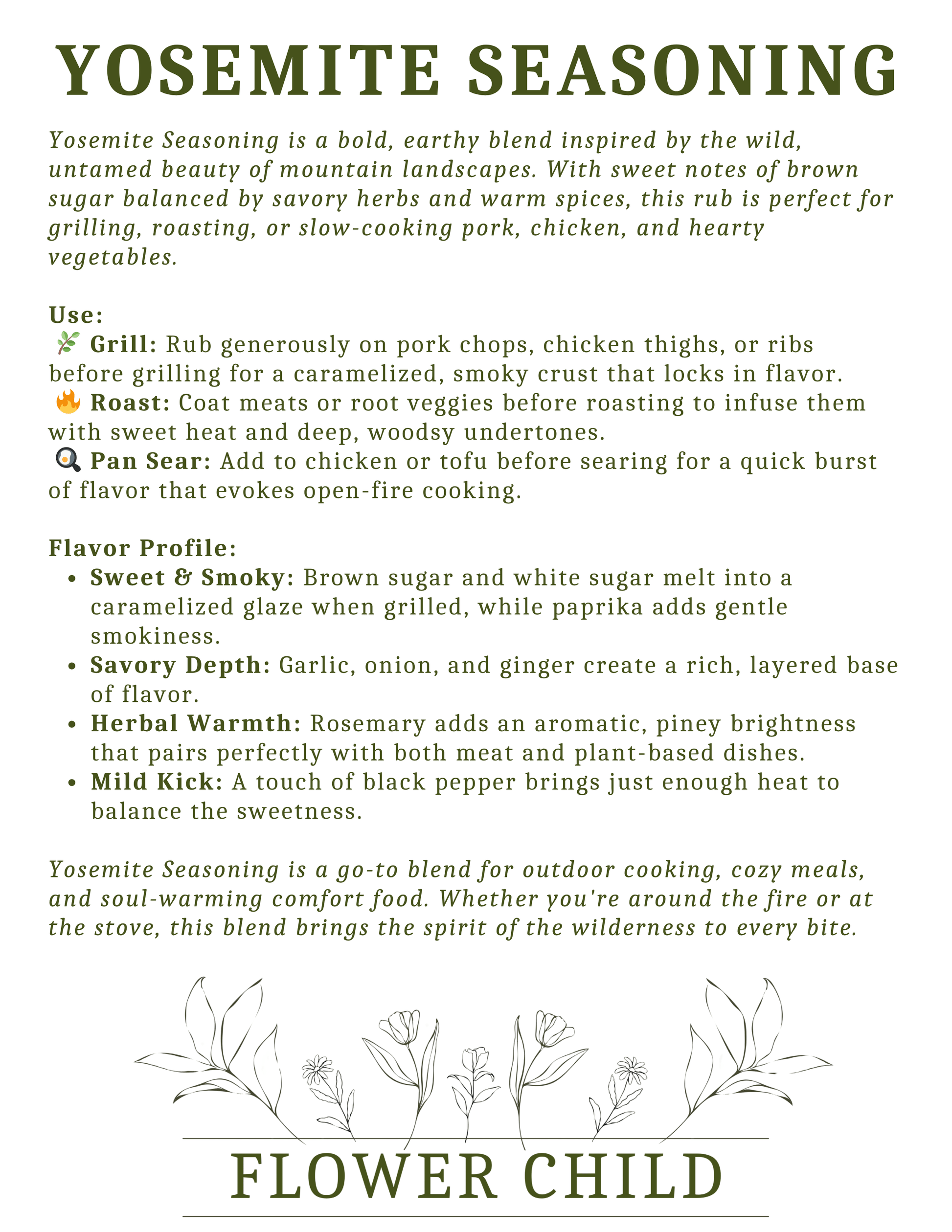 Bring the taste of the great outdoors to your grill with Yosemite, a bold, smoky-sweet seasoning inspired by open fires and forest air. This rustic blend of sugar, brown sugar, smoked paprika, cracked pepper, garlic, ginger, onion, and fragrant rosemary delivers the perfect balance of sweet, savory, and herbal warmth—ideal for everything from backyard BBQs to campfire classics.