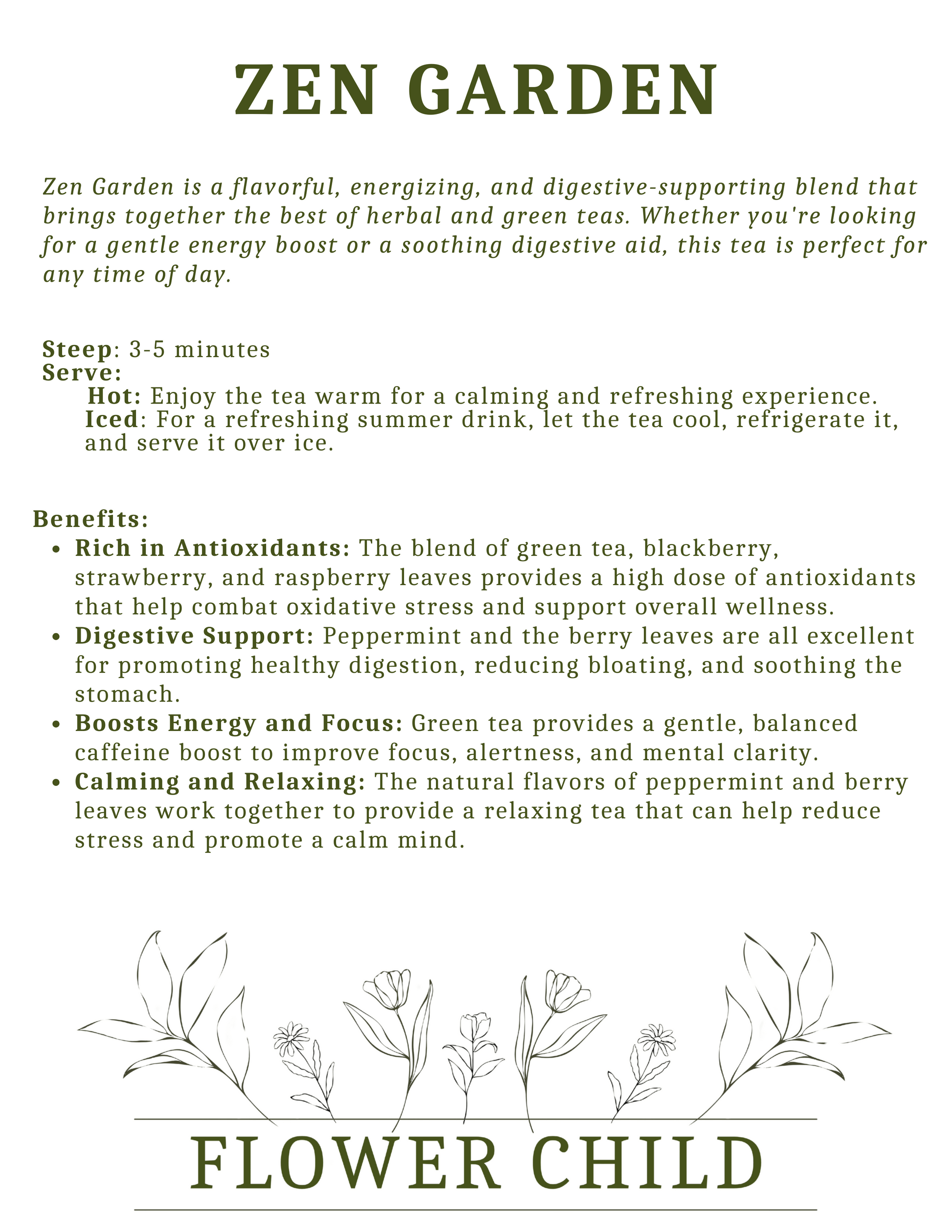 Step into serenity with Zen Garden, a rejuvenating blend of raspberry, blackberry, and strawberry leaves, delicately balanced with green tea and a cool touch of peppermint. This grounding infusion brings the peace of a quiet morning in a dew-kissed garden straight to your cup.
